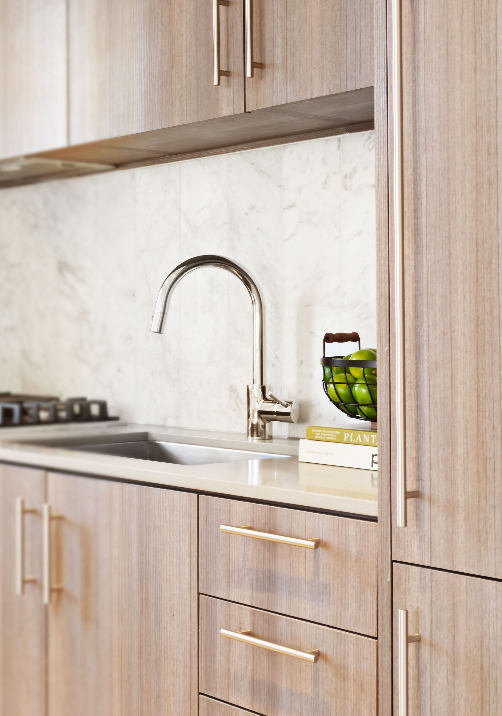 - Integrated Liebherr refrigerator and Fisher Paykel dishwasher are concealed within the millwork