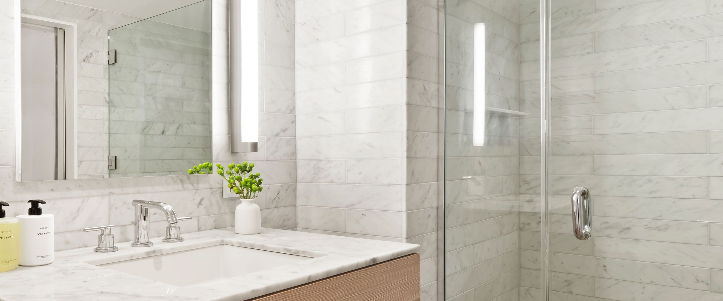 Polished and serene, the bathrooms at The Perrie possess a classic elegance. These tranquil spaces are appointed with timeless stone and modern fixtures designed to put both mind and body at ease. A custom chrome and glass medicine cabinet and chrome faucet and shower head by Grohe reflect the floor-to-ceiling backdrop of honed Italian marble. The marble-topped custom vanity features a Kohler sink and is illuminated with warm light from an Artimide fixture.